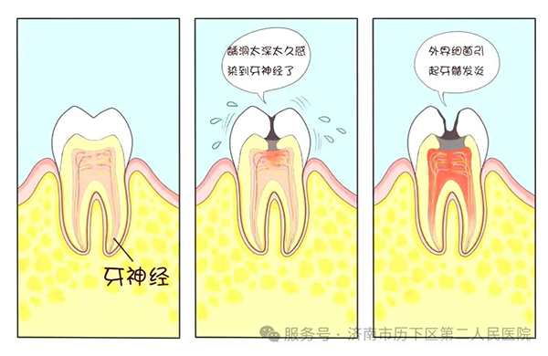牙髓,俗称“牙神经”,主要包含牙齿的神经和血管。它处于牙齿中央,被外层的牙体包裹,正常情况下不与外界相通。当龋病很深很久了,外面包被的牙体硬组织被腐蚀破坏了,牙髓才会与外面的细菌接触,受到感染引发牙髓炎,也就是俗称牙神经发炎了。